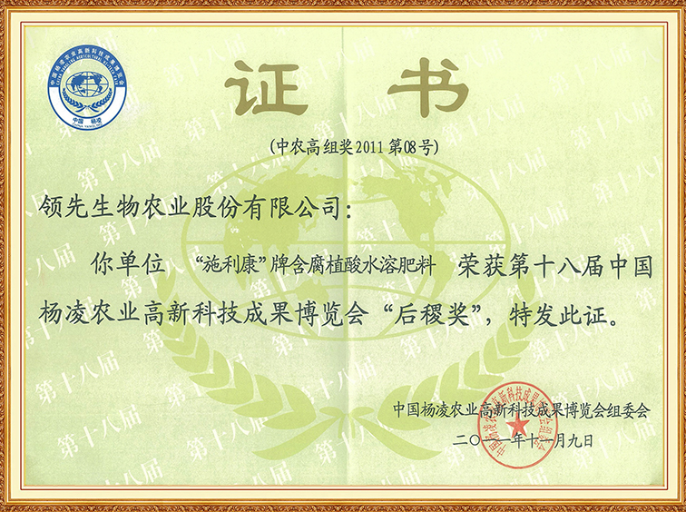 施利康牌含腐植酸水溶肥料—第十八屆中國楊凌農博會“后稷獎”
